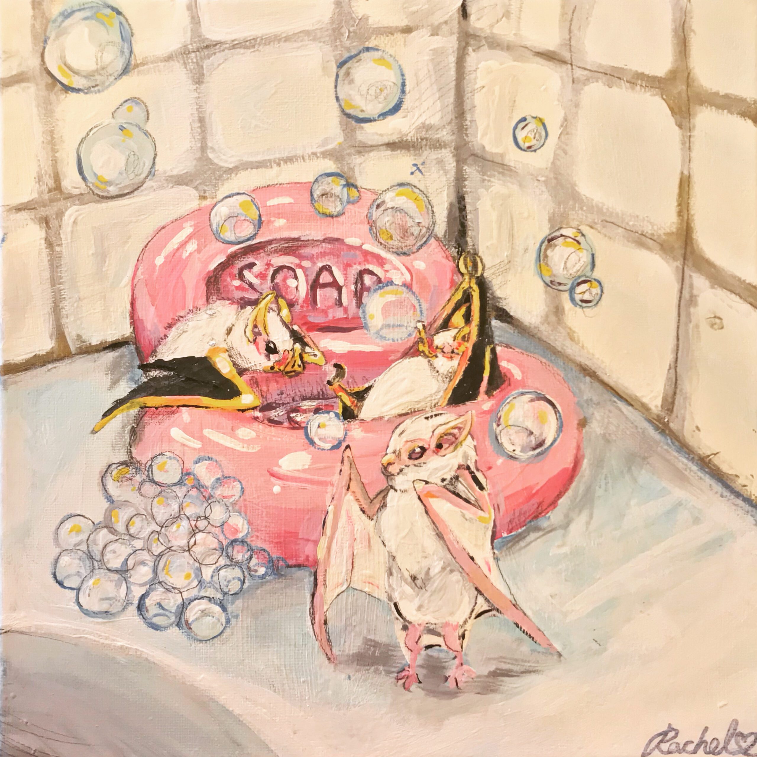 This piece was made for a friend for her bat-themed bathroom decor. It includes three Honduran White Bats.