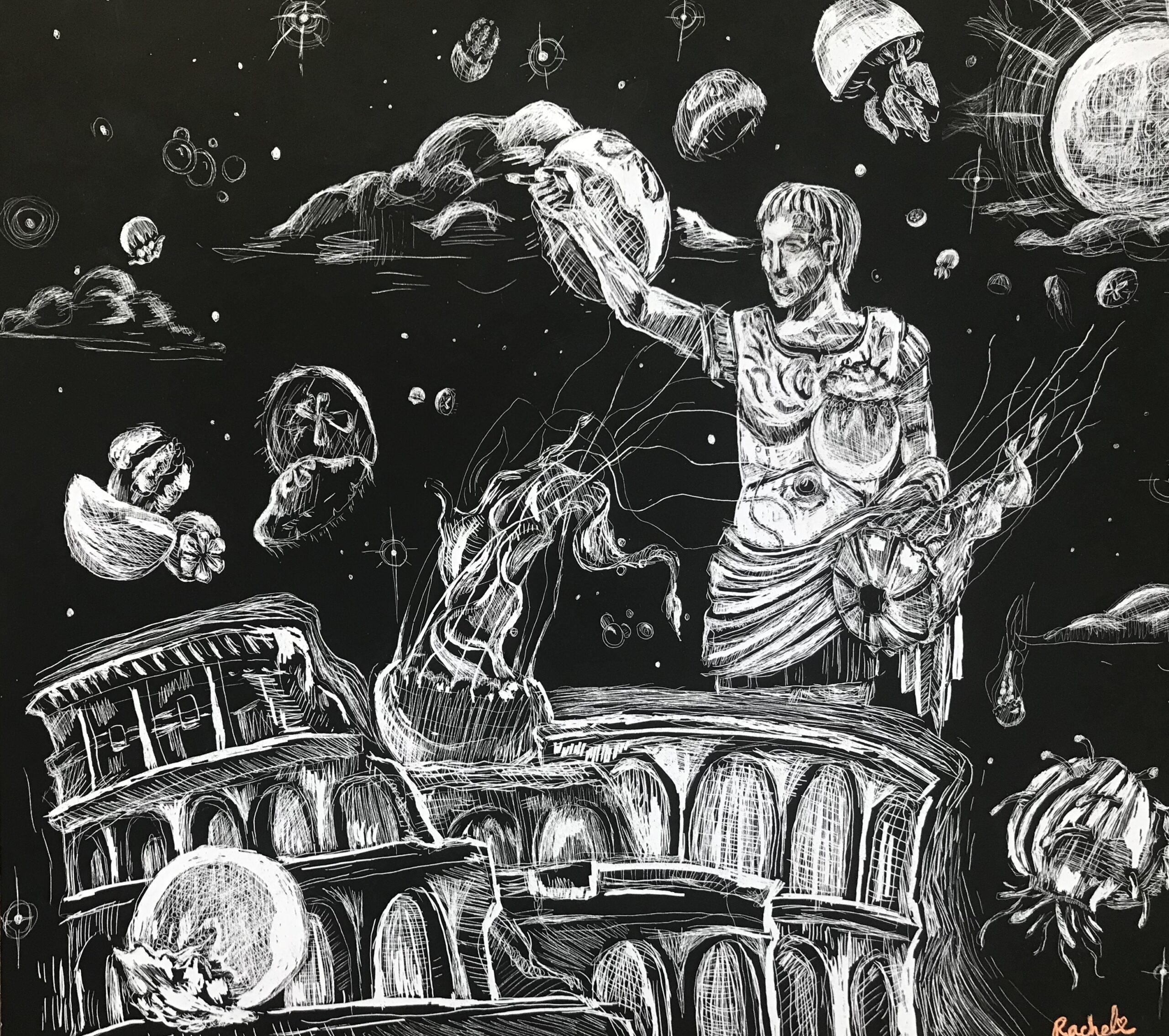 This piece combines Roman art and architecture and six species of jellyfish. - 3/6 Cephalopod and Architecture Series