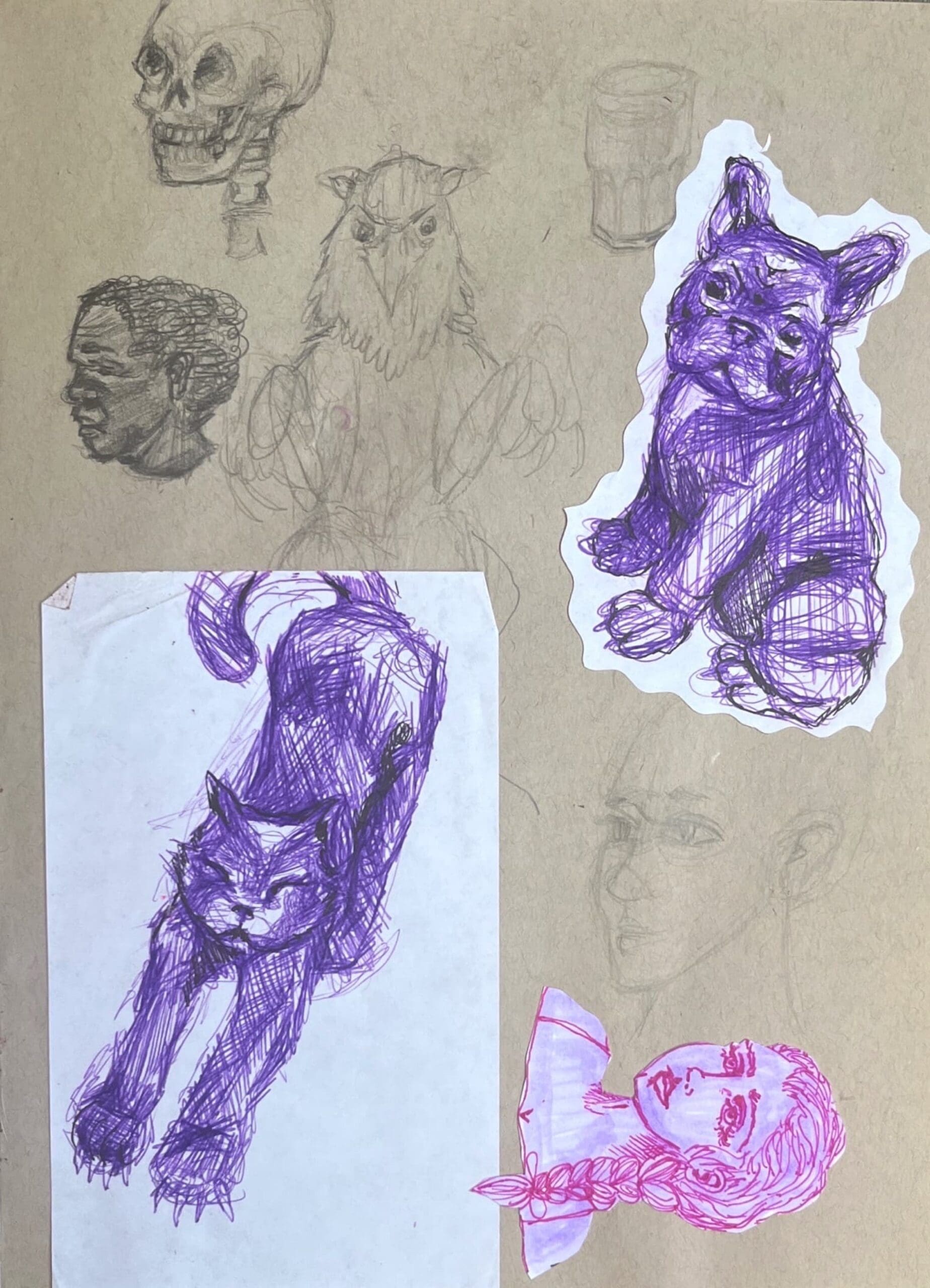 This sketch includes a black cat, faces, a griffon, a glass, and a French bulldog.